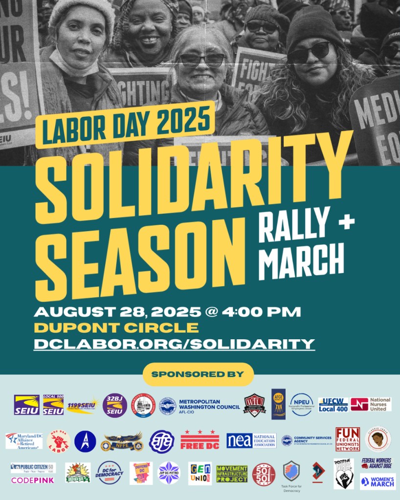 In a time where the rights and freedoms of DC citizens are under attack due to the Trump administration’s militarization of the district, it is imperative that labor will continue to organize and push back. I especially like how this protest has a wide variety of cosponsoring organizations, including many labor orgs, Free DC, Jewish Voice for Peace, the Democratic Socialists of America National Labor Commission, and many more. Workers rights, immigrants rights, and rights of DC citizens are all connected and should be defended no matter what.