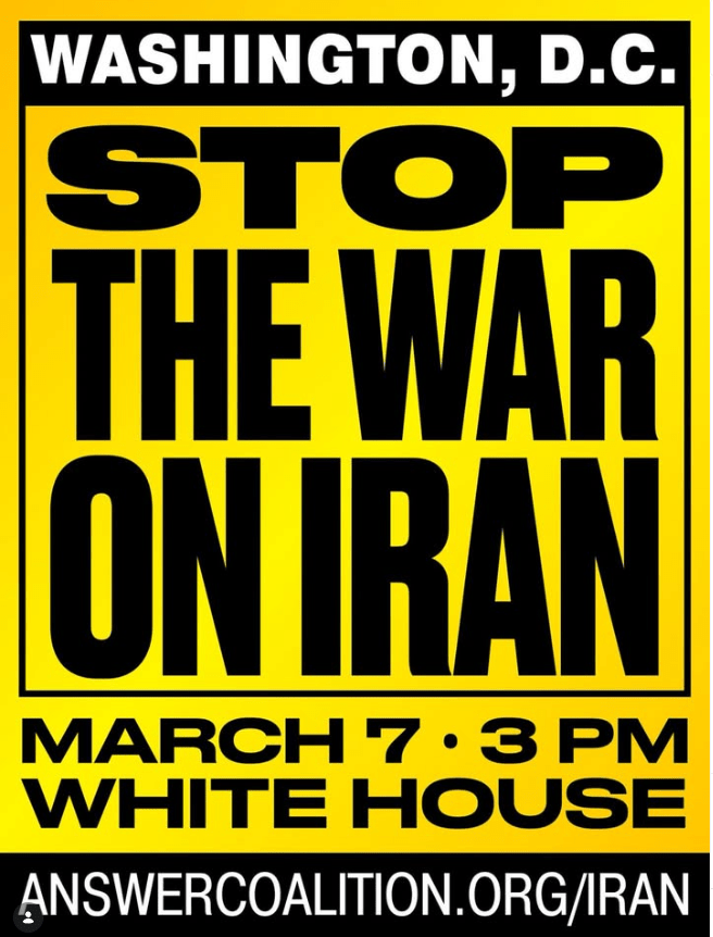 In Washington D.C., a coalition of groups including American Muslims for Palestine, the Palestinian Youth Movement, the Democratic Socialists of America, the Party for Socialism and Liberation, among others, will be gathering in front of the White House at 3PM on March 7th to rally against this illegal war.
